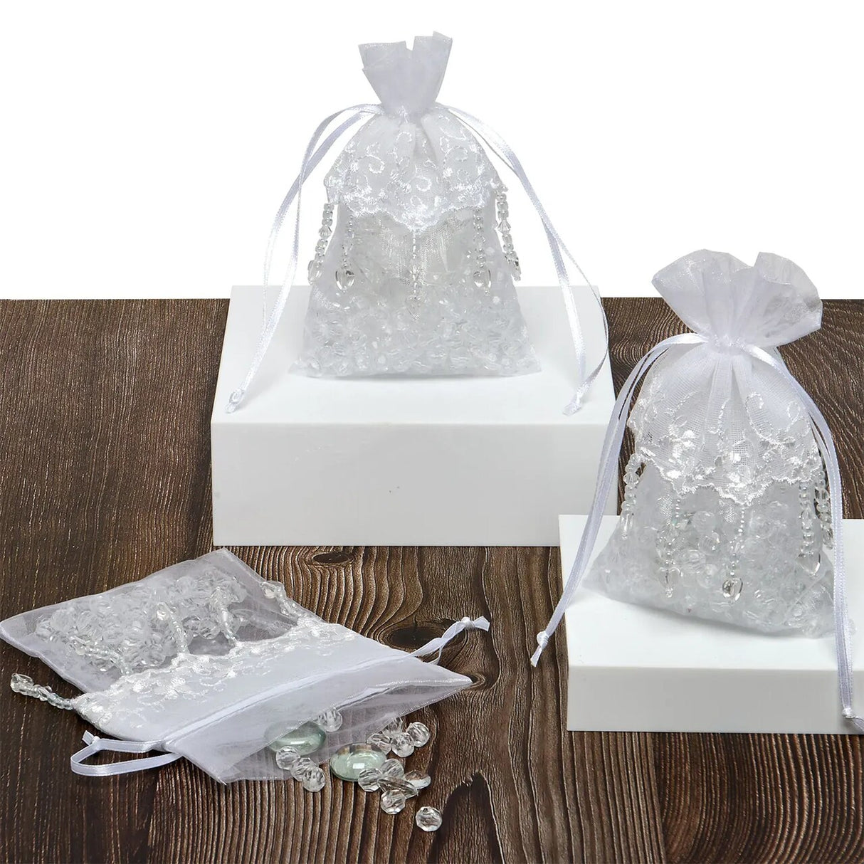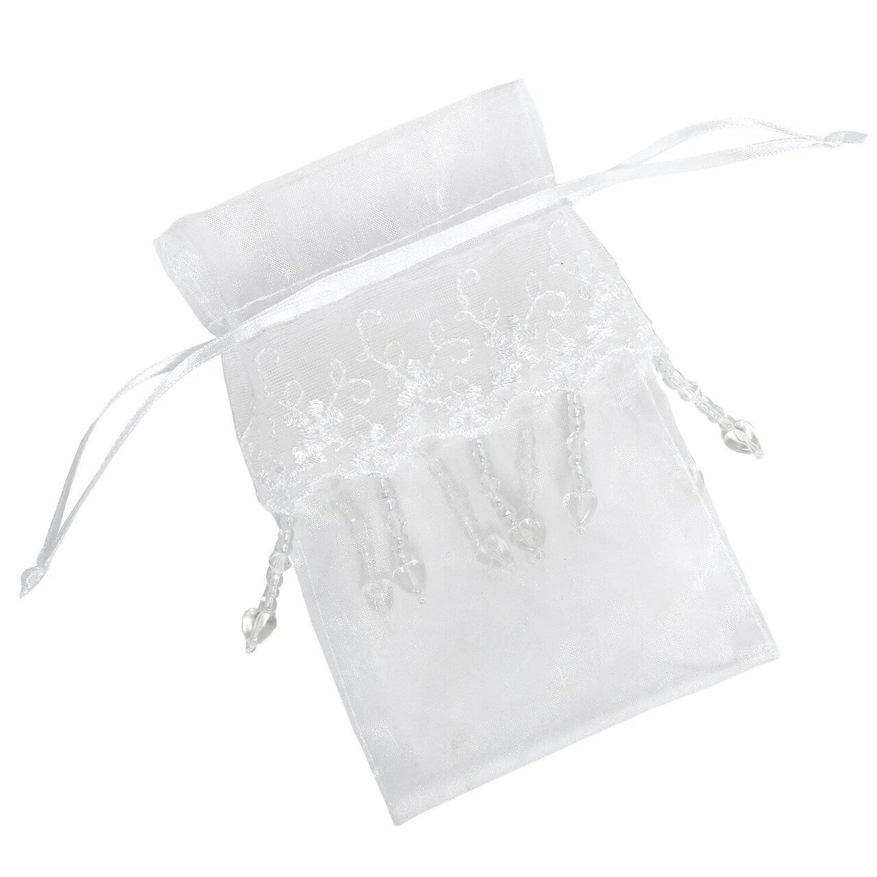 Lace Skirt Beaded Organza Bags White 4'' x 6'' for Gifts - White / 24 counts is backordered and will ship as soon as it is back in stock.