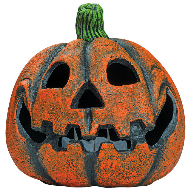 Add this Happy Pumpkin Prop to your deck or entryway and create a spooky Halloween vibe that is also cheerful! This decorative Pumpkin Prop measures 9 inches tall and almost 2 feet around! It's made of Resin and hand-painted in detail to look like an orange grinning Jack O' Lantern with a green stem. You can add a flameless Tea Light for a cool and safe light-up effect. Great no-fuss addition to your next Halloween scene!