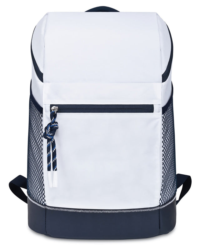 Description: A classic and functional backpack cooler with a nautical twist. Made with 420D nylon and 600D polyester, this cooler features a water-resistant TPU-coated bottom and a wipe-clean interior PEVA lining. It has a large opening for easy access and an interior slash pocket for stashing snacks or utensils. The front zippered pocket includes a bottle opener, and the cooler also comes with two stretch mesh side pockets for bottles or accessories. The padded back panel and adjustable sports mesh straps provide comfort, while the sternum strap ensures easy carrying.