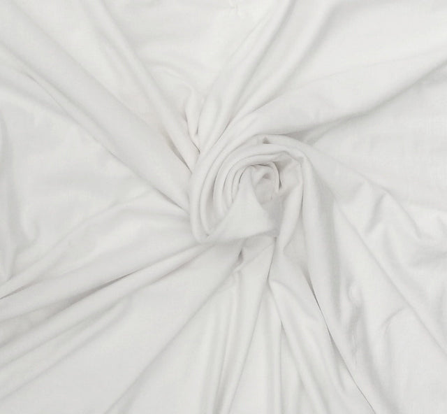 Wrap yourself in eco-luxury with this Pure White Bamboo Spandex Jersey Knit. It delivers exceptional softness, breathability, and four-way stretch for all-day comfort. Its silky drape and moisture-wicking properties make it ideal for crafting everything from flowy dresses and loungewear to undergarments and baby apparel. The clean white hue provides a versatile canvas for dyeing or wearing as-is for a minimalist, modern look.