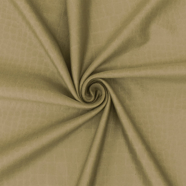 This brass brown reptile jacquard double knit fabric offers a stylish design with a subtle beige undertone. Made with nylon spandex, it provides exceptional four-way stretch and flexibility for activewear, yoga clothing, and costumes. The jacquard reptile pattern adds texture and dimension, making it ideal for fashion-forward apparel or statement performance outfits. With its soft hand and lustrous finish, this fabric balances comfort with a bold and unique appearance.