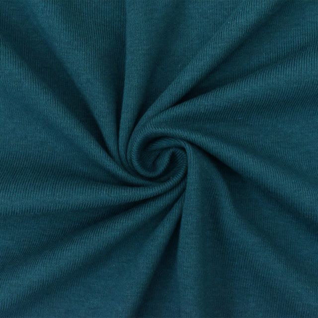 This Deep Teal 1x1 rib knit fabric combines organic cotton, recycled polyester, and spandex to provide a soft, durable, and eco-friendly textile. Featuring four-way stretch and a matte finish, it is ideal for apparel like basic tees, blouses, dresses, activewear, and dancewear. Machine washable for effortless