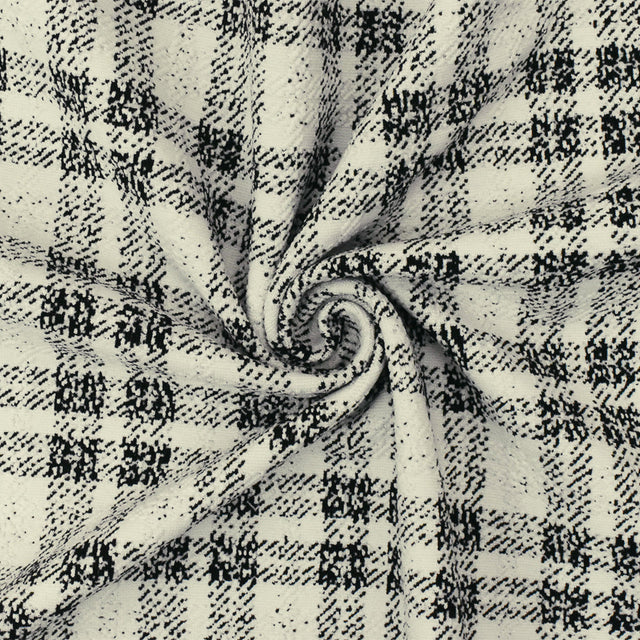 This Black?White Famous Maker Plaid Jacquard fabric is a premium nylon spandex double knit designed for activewear and performance apparel. With its soft yet textured hand and matte finish, it offers both comfort and style. The fabric has excellent four?way stretch and full body drape, making it perfect for leggings, dancewear, and costumes. Durable and versatile, it is ideal for sports, fashion, and performance projects.