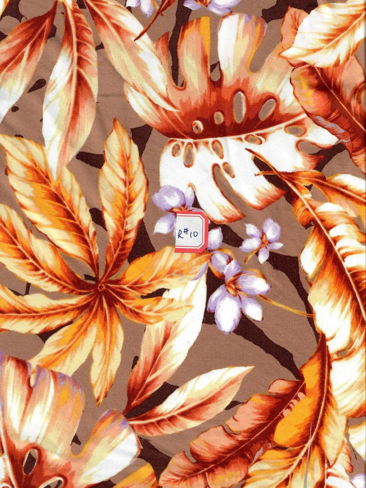 This 1 Yard Polyester Spandex 170 GSM DTY Brushed Leaf Tropical Print Fabric features a smooth, brushed texture and vibrant nature-inspired designs. Made from 96% Polyester and 4% Spandex, this lightweight fabric offers soft stretch and a fluid drape, ideal for creating breathable and flexible garments. With a 58/60 inch width, it's perfect for tops, dresses, skirts, and resortwear. The tropical leaf print adds a fresh and lively aesthetic to any project.