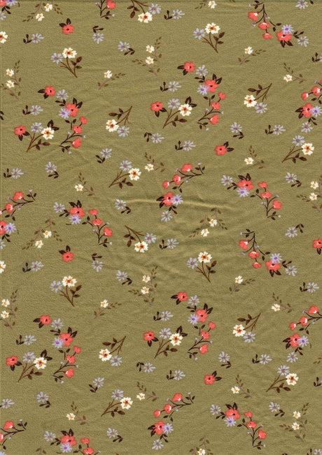 1 Yard Olive Vintage Ditsy Floral Brushed DTY Knit Fabric Soft Stretch 58/60" Wide