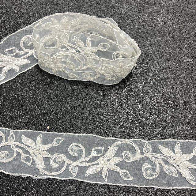 1 Yard White Beaded & Corded Lace Trimming on Net Mesh | 2" Wide | Elegant Embroidered Trim for Bridal, Evening & Formal Wear