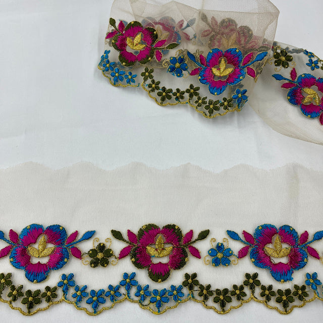 Add a vibrant and artistic touch to your special occasion garments with this Colorful Floral Lace Trimming Embroidered on 100% Polyester Net Mesh. This handmade, high quality trim features delicately stitched multicolor floral motifs, perfect for enhancing wedding dresses, evening gowns, dance costumes, and more. The lightweight net mesh base provides flexibility, while the colorful embroidery adds a striking visual element to any creation. Measuring approximately 2.5 inches in width, this trim is ideal for detailed dressmaking and costume design.