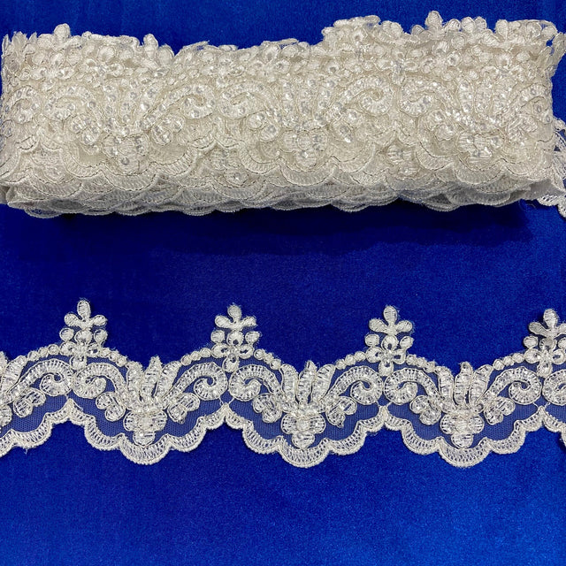 1 Yard Beaded & Corded Lace Trimming on Net Mesh – 3" Wide with Silver | Embroidered Couture Lace for Dresses - Ivory with Silver is backordered and will ship as soon as it is back in stock.