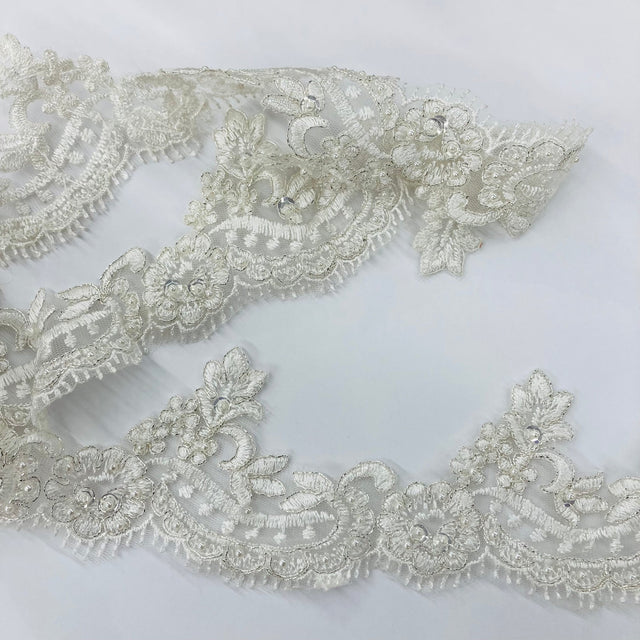 1 Yard Beaded & Corded Lace Trimming on Net Mesh – 3" Wide | Embroidered Decorative Lace for Dresses & Costumes