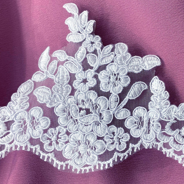 Elevate your bridal gowns, evening dresses, quinceanera outfits, and dance costumes with this exquisite Corded Lace Trimming embroidered on 100% polyester net mesh. Handmade with lightweight, high quality fabric, this 5 inch wide trim features colorful and intricate embroidery that adds a delicate and sophisticated touch to any special occasion garment. Ideal for wedding dresses, prom gowns, and festive costumes, this couture lace trim is the perfect finishing detail for creating timeless elegance.