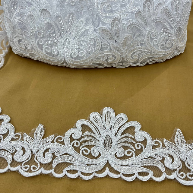 1 Yard Premium Beaded & Corded Floral Lace Trimming on 100% Polyester Net Mesh for Dresses 3.5 Inch Width