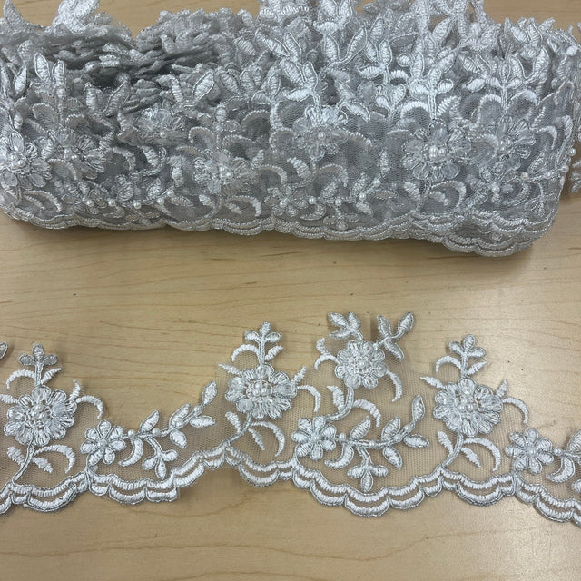 1 Yard Beaded Corded Lace Trim 4" Wide White with Silver Embroidered on 100% Polyester