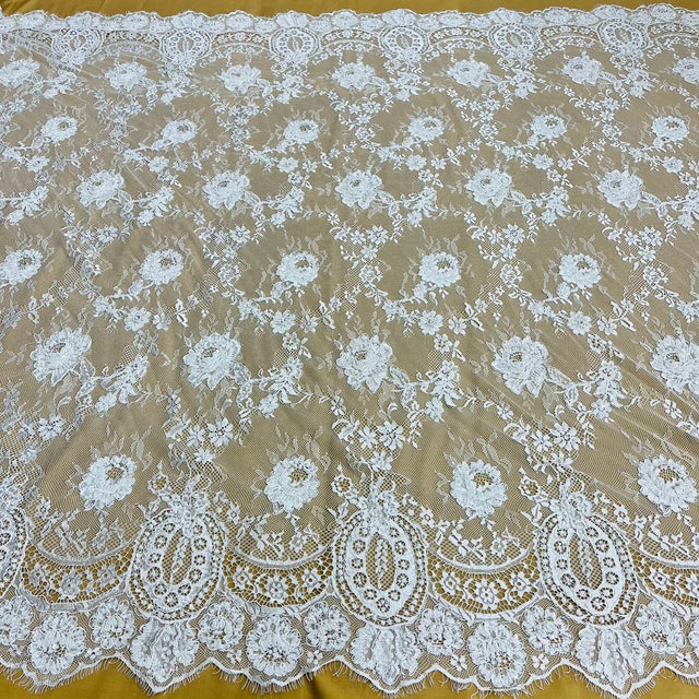 Enhance your special occasion creations with this Beaded & Corded Chantilly Floral Lace Fabric, meticulously crafted on 100% polyester net mesh. Featuring scalloped edges, intricate floral embroidery, and shimmering beads and sequins, this 3-yard precut lace is perfect for wedding gowns, bridal veils, quinceañera dresses, communion attire, and elegant dance costumes.