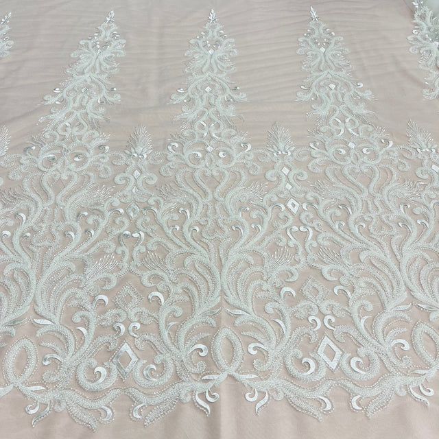 Elevate your special occasion creations with our Beaded Lace Fabric, delicately embroidered with soft fuzzy threads and shimmering beads on premium 100% polyester net mesh. Perfect for couture bridal gowns, evening dresses, quinceañera attire, and dance costumes, this lightweight lace adds elegance, texture, and a designer touch to any garment.