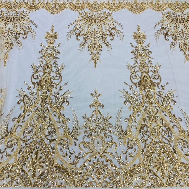 1 Yard Luxurious Beaded Lace Fabric Embroidered on Polyester Net Mesh 52" Wide Elegant Formalwear Material - Gold is backordered and will ship as soon as it is back in stock.