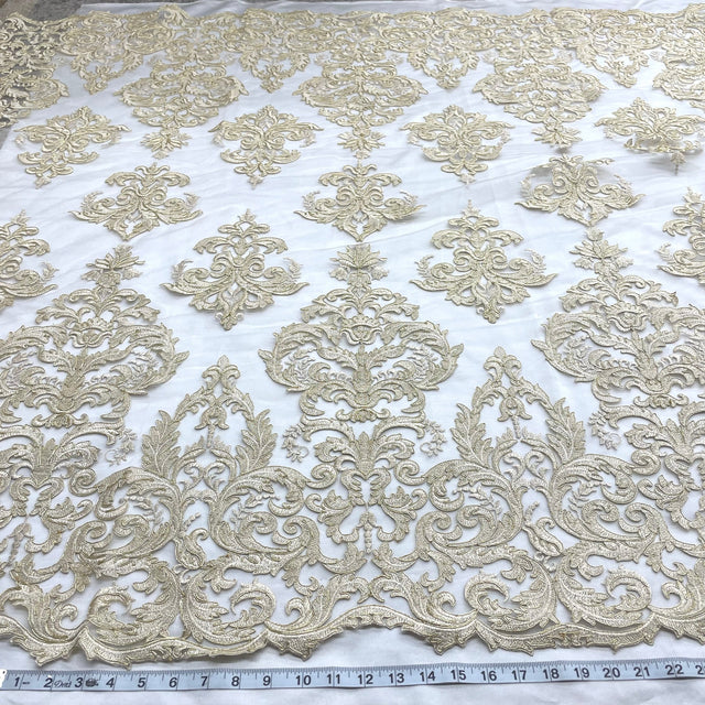 1 Yard Elegant Corded Bridal Lace Fabric Embroidered on Premium Polyester Mesh 54 - Gold is backordered and will ship as soon as it is back in stock.