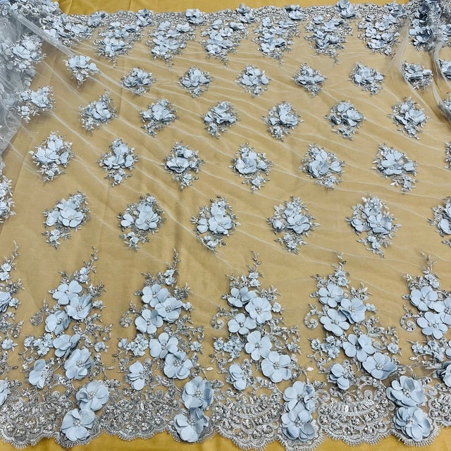 Make a statement with this luxurious beaded 3D floral lace fabric embroidered on 100% polyester net mesh. Perfect for couture bridal gowns, evening dresses, quinceanera outfits, and dance costumes, this exquisite fabric features intricate 3D floral embroidery with sparkling beads for a glamorous and unique look. Lightweight yet durable, it drapes beautifully while adding texture and elegance to any special occasion garment. Approximately 54 inches wide and available in multiple colors, this premium lace fabric elevates your designs with sophistication and high-end style.