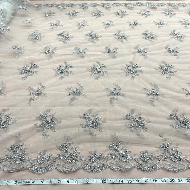 1 Yard Luxurious Beaded & Corded Bridal Lace Fabric Embroidered on Polyester Net Mesh – 54" - Silver is backordered and will ship as soon as it is back in stock.