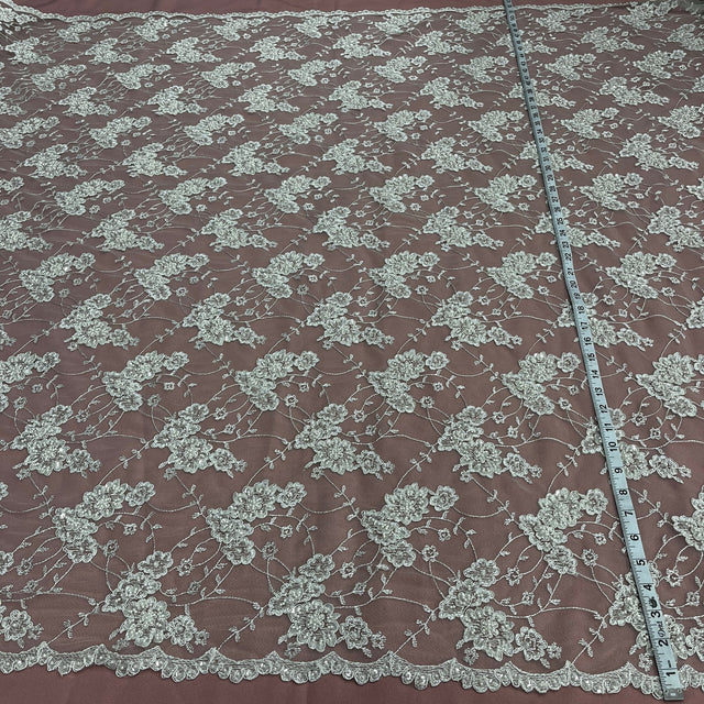 Add a touch of luxury to your special occasion with this exquisite silver beaded and corded lace fabric embroidered on soft 100% polyester net mesh. Perfect for crafting elegant wedding gowns, evening dresses, quinceañera outfits, and dance costumes, this fabric combines shimmering beaded details with intricate corded embroidery for a rich, couture finish. Its lightweight yet durable construction ensures comfort and structure, while the romantic floral design enhances any garment with timeless sophistication. Ideal for designers and DIY creators seeking elegance and quality.