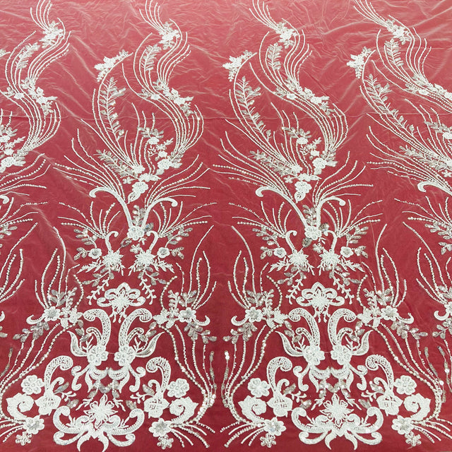 Bring couture elegance to your special occasion creations with this ivory beaded lace fabric embroidered on 100% polyester net mesh. Featuring hand-applied beads, sequins, and pearls, this luxurious lace is perfect for wedding gowns, evening dresses, quinceañera outfits, and dance costumes. Lightweight yet durable, it drapes beautifully while adding sparkling texture and sophistication to any design. Available in four exquisite colors, this high-quality lace allows designers and hobbyists to craft show-stopping, memorable garments. Sold by the yard for custom projects.
