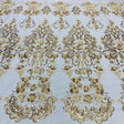 Elevate your designs with this luxurious beaded lace fabric embroidered on 100% polyester net mesh. Perfect for bridal gowns, evening dresses, quinceañera outfits, and dance costumes, it features cascading beads and sequins for a sophisticated and glamorous finish. Soft yet durable, this lace fabric adds elegance and couture style to any special occasion ensemble.