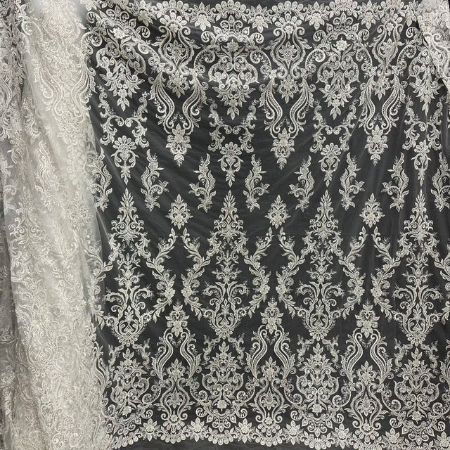 Introducing Beaded & Sequined Lace Fabric Embroidered on 100% Polyester Net Mesh – perfect for creating a beautiful and unique wedding dress, evening gown, or dance costume. This high-quality product is handmade with only the finest fabrics. Embellish your design with pearls, sequins, and beads. This 100% polyester lace fabric gives off an ethereal, delicate look perfect for any special occasion. Make an unforgettable entrance with its statement-making embroidery and mesh tulle trimming.