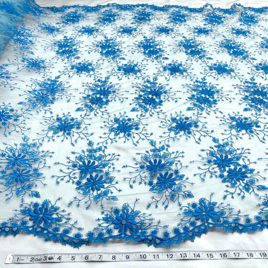 Enhance your special occasion outfits with this floral embroidered lace fabric made from 100% polyester net mesh. Perfect for bridal gowns, evening dresses, quinceañera ensembles, and dance costumes, it features intricate floral embroidery for a luxurious and elegant touch. Soft yet durable, this fabric elevates any garment with sophistication. Available in five stunning colors to match your design needs.