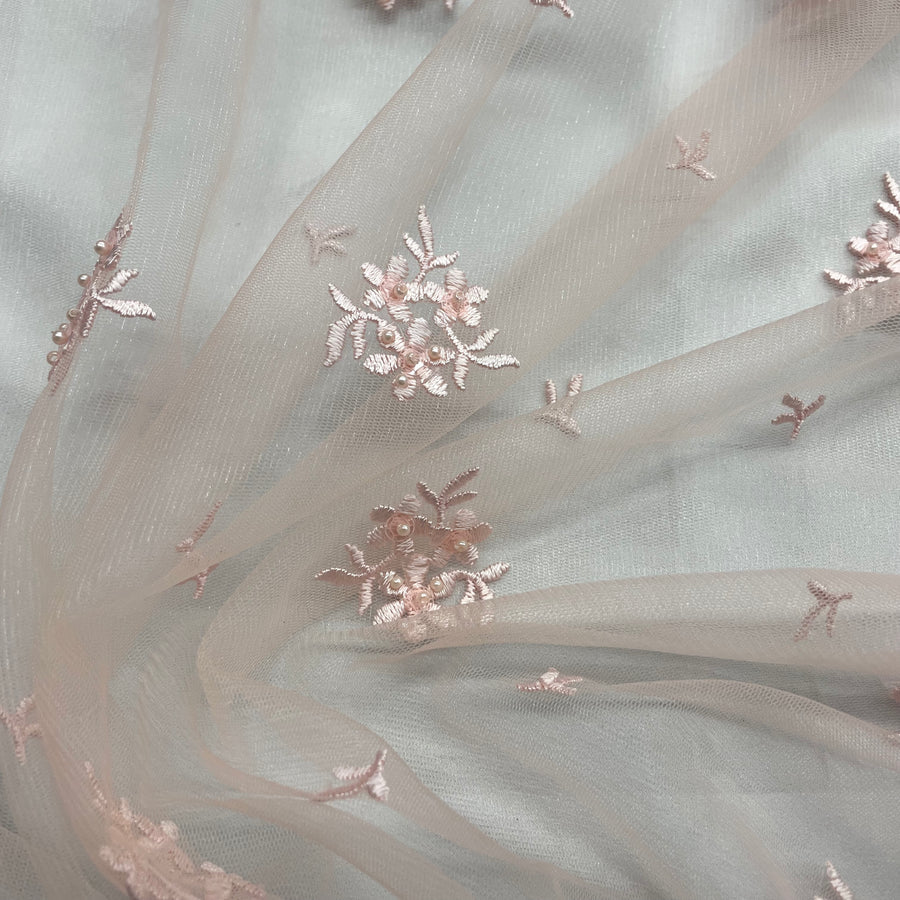 1 Yard - Beaded Lace Fabric Embroidered on 100% Polyester Net Mesh - Ivory - 54" Wide - Peach is backordered and will ship as soon as it is back in stock.