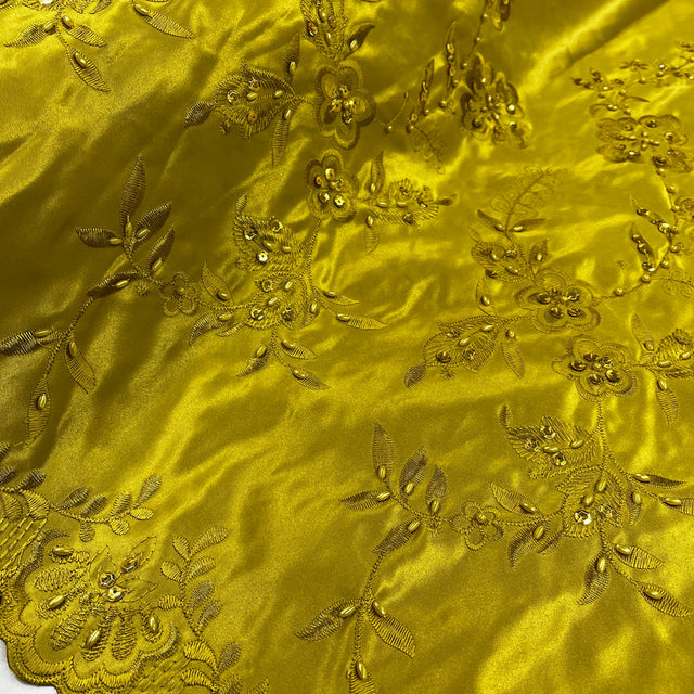 Yard - Beaded Bridal Lace Fabric Embroidered on 100% Polyester Satin - Ivory with Gold - 54" - Black is backordered and will ship as soon as it is back in stock.