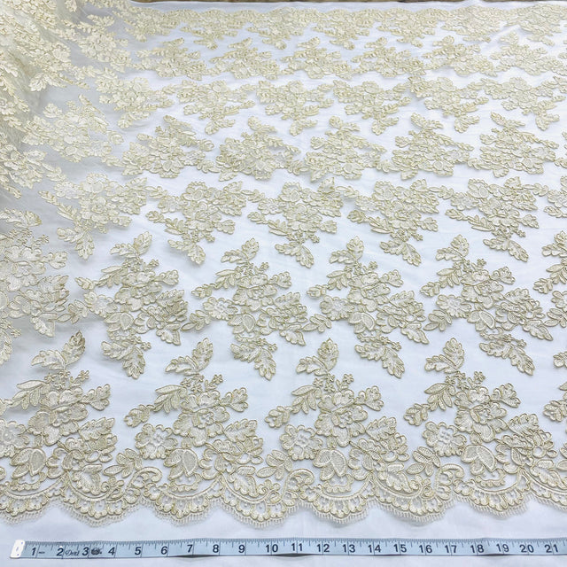 1 Yard - Corded Bridal Lace Fabric Embroidered on 100% Polyester Net Mesh - 51" Wide