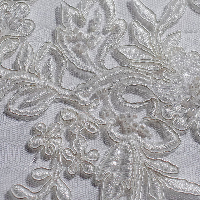 1 Yard Beaded and Corded Bridal Lace Fabric Embroidered on Polyester Net Mesh