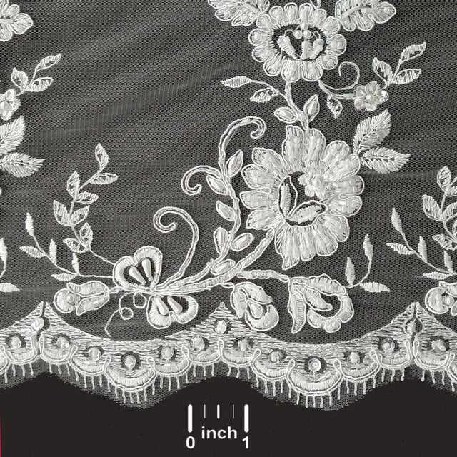 1 Yard Elegant Beaded and Corded Bridal Lace Fabric Embroidered on Polyester Net Mesh