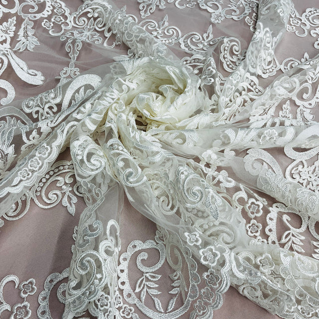 Elevate your sewing projects with this luxurious corded bridal lace fabric embroidered on 100% polyester net mesh. Perfect for wedding dresses, evening gowns, quinceañera dresses, and dance costumes, this lace combines delicate floral design with sturdy, lightweight craftsmanship. Available in three stunning colors, it adds elegance and sophistication to any garment or decorative project.
