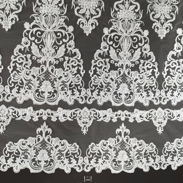 1 Yard Beaded and Corded Lace Fabric Embroidered on Polyester Net Mesh White and Ecru - Ivory / 51"Wide is backordered and will ship as soon as it is back in stock.