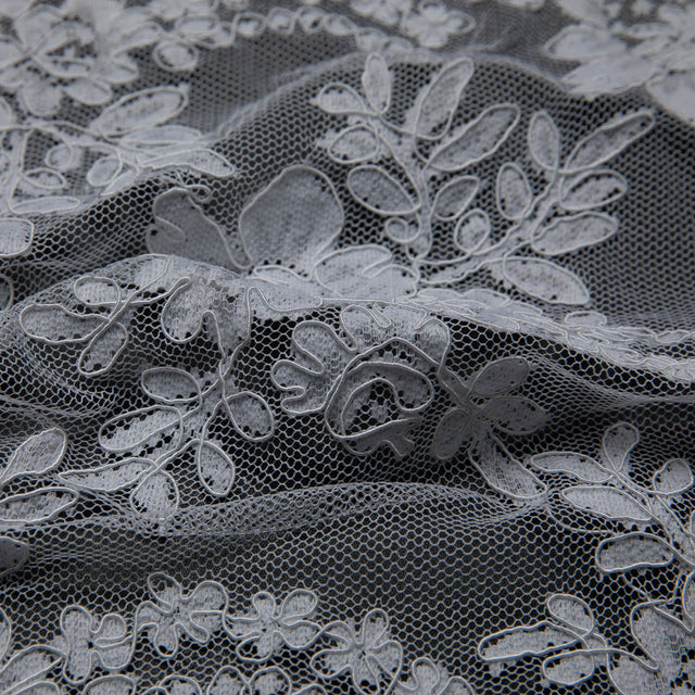 This exquisite Re-Embroidered Lace fabric, measuring 52/54 inches wide, showcases a beautiful floral pattern highlighted by intricate cordwork. The delicate lace and raised cords create a captivating three-dimensional effect, providing a luxurious tactile experience. Ideal for bridal gowns, evening wear, accessories, and elegant home décor, this fabric enhances any project with refined texture and elegance.