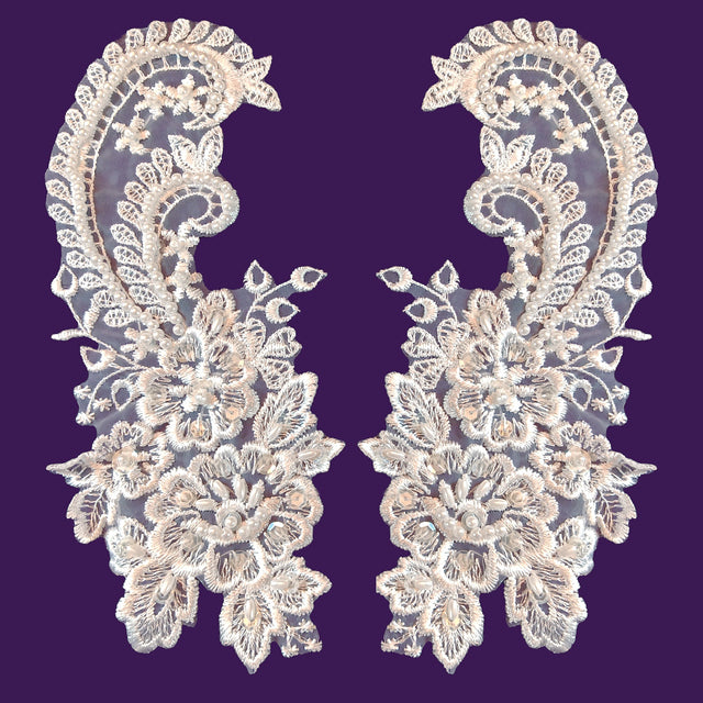 1 Pair Beaded Bridal Lace Applique Embroidered on 100% Polyester Organza 8.75" x 4" Each Side - White is backordered and will ship as soon as it is back in stock.