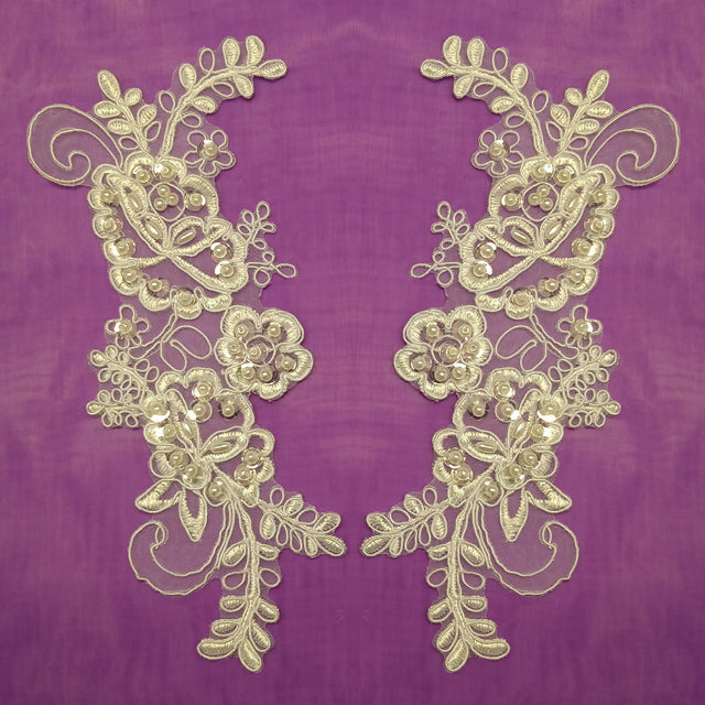 1 Pair Beaded & Corded Lace Applique Embroidered on 100% Polyester Organza 7.5" x 2.75" Each Side - Ivory is backordered and will ship as soon as it is back in stock.