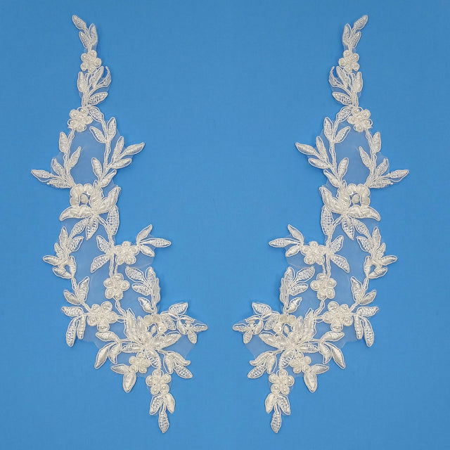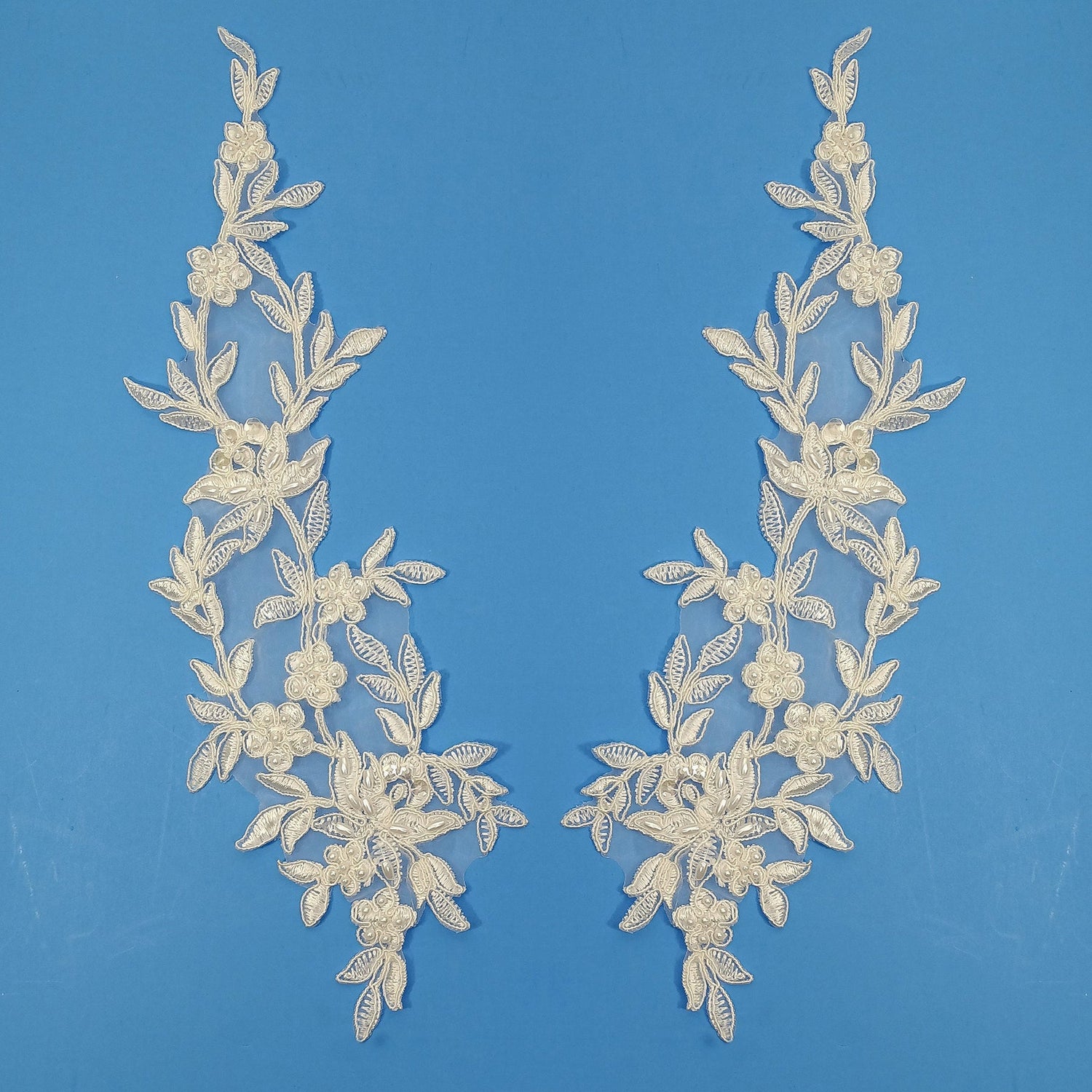1 Pair Beaded & Corded Floral Lace Applique Embroidered on 100% Polyester Organza 13" x 4" Each Side