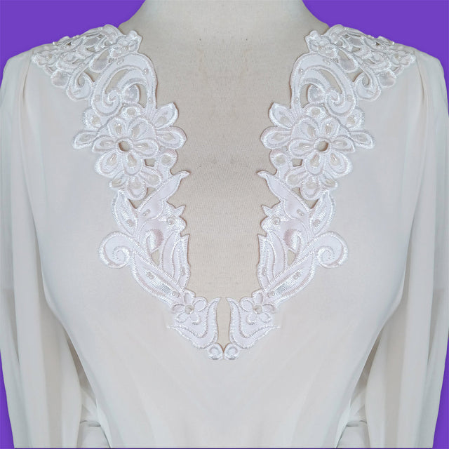 Add timeless beauty and rich texture to your garments with this handcrafted beaded lace applique, embroidered on heavyweight 100% polyester satin. Ideal for bridal gowns, veils, christening dresses, communion outfits, and heirloom projects, this applique delivers stunning elegance for special occasions.