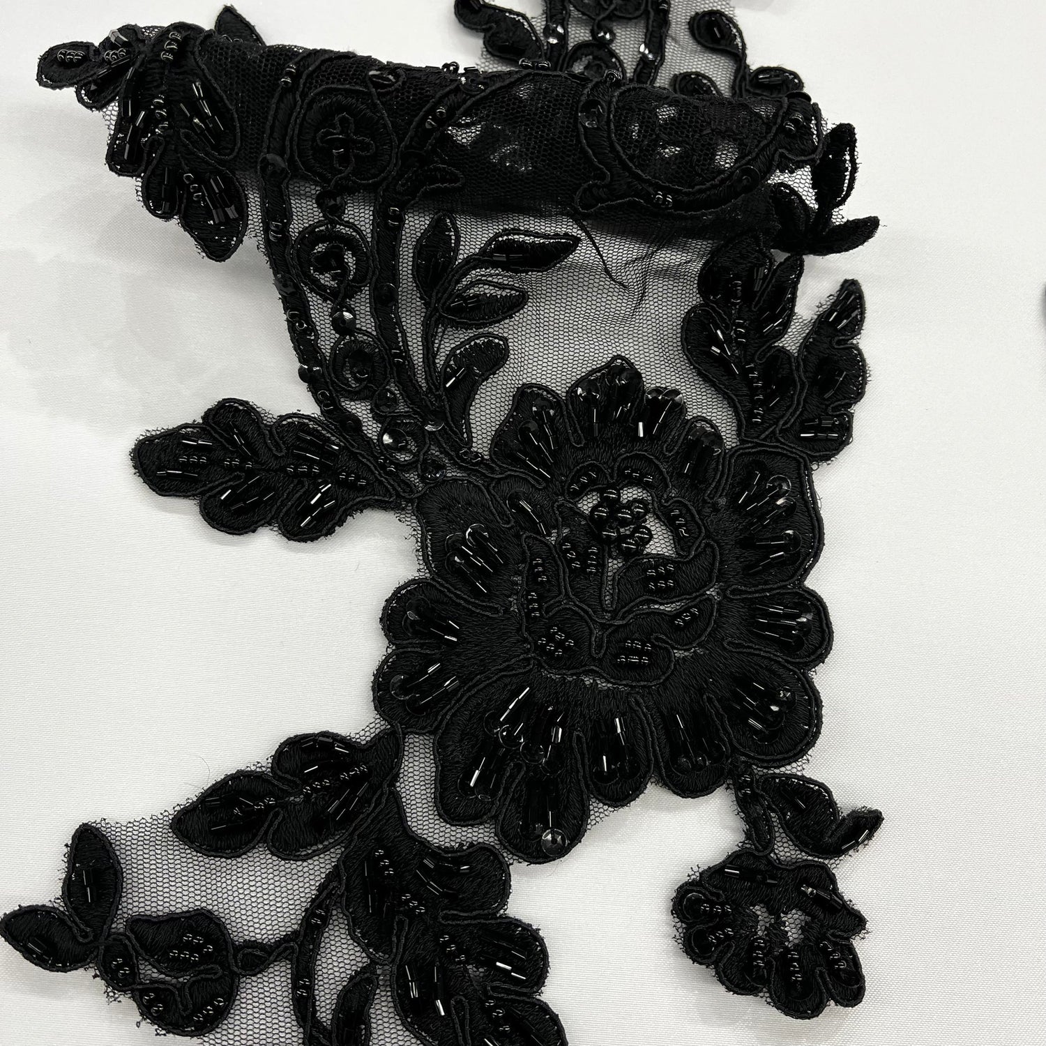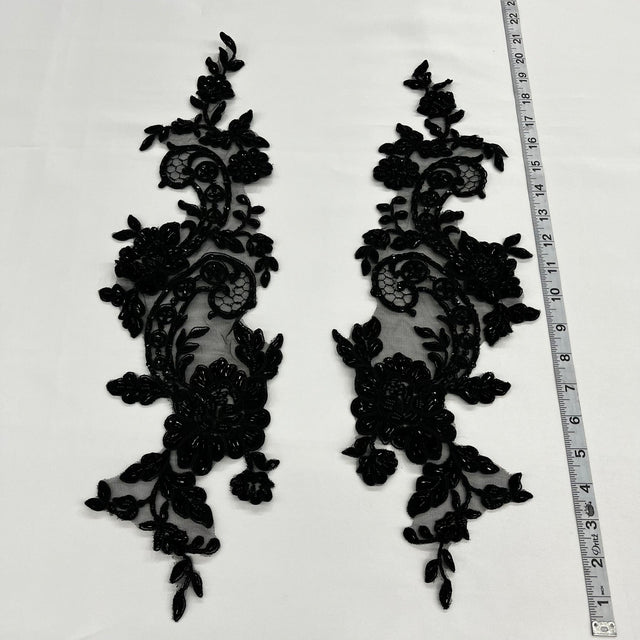 1 Pair 20" x 5.5" Beaded & Corded Floral Lace Applique on 100% Polyester Mesh - Black is backordered and will ship as soon as it is back in stock.