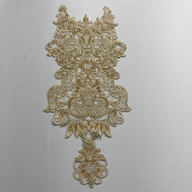 Beaded & Corded Lace Medallion Applique on 100% Polyester Mesh 25" x 10.5" - Gold is backordered and will ship as soon as it is back in stock.