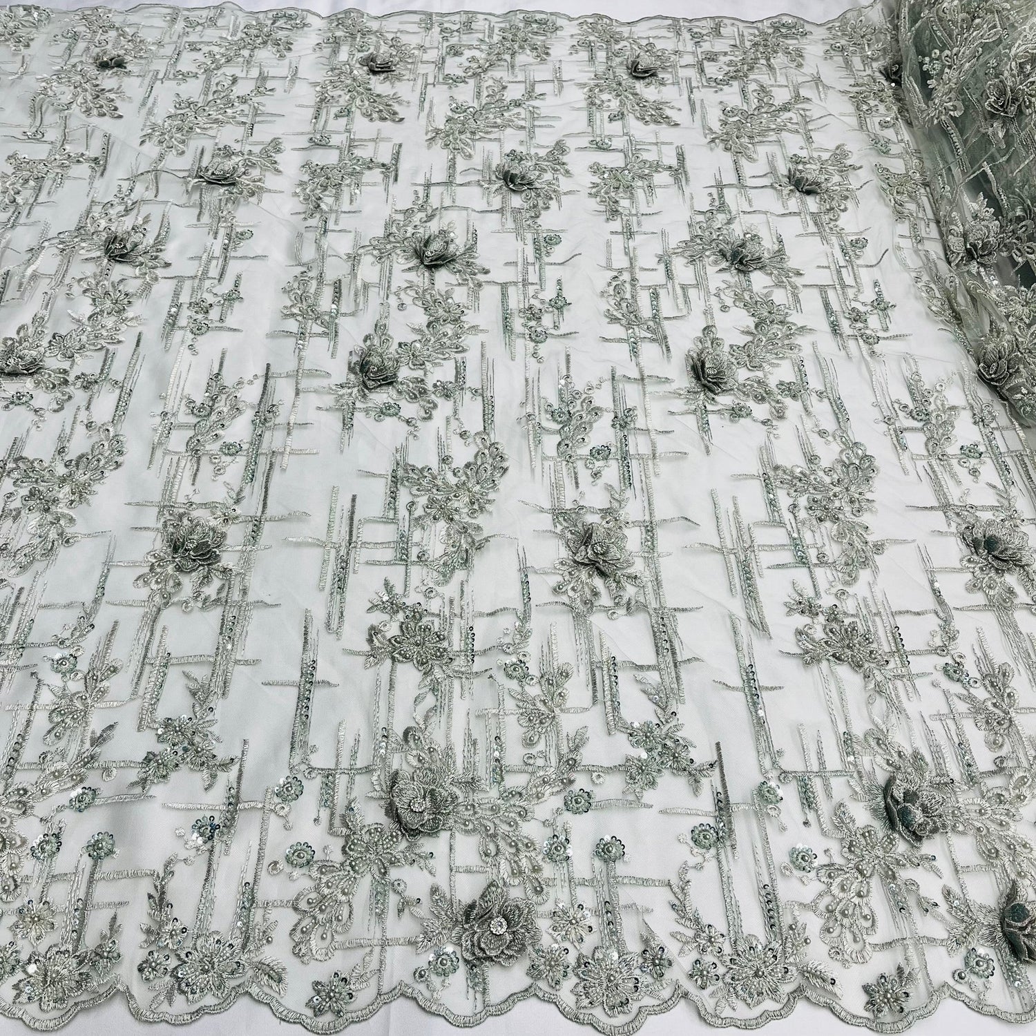 1 Yard Beaded Rhinestone 3D Floral Lace Fabric Embroidered 100 Percent Polyester Net Mesh 50 inch Width