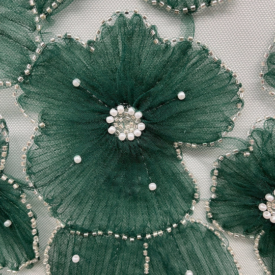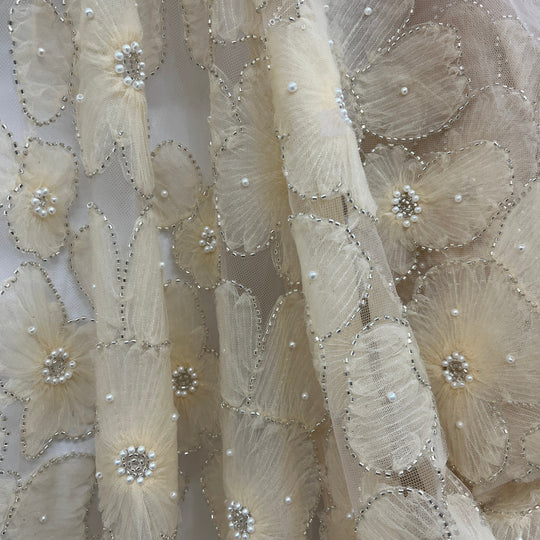 - Material: 100% Polyester Net Mesh with 3D floral appliqués and hand-beaded pearls and seed beads