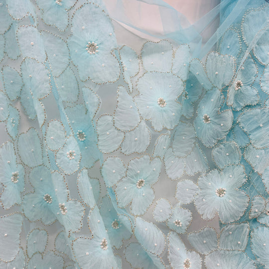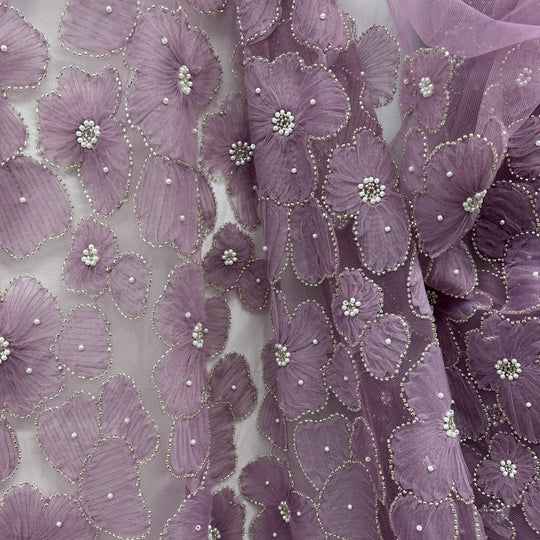 Elevate your couture creations with this luxurious beaded 3D floral lace fabric, expertly embroidered on 100% polyester net mesh. Featuring delicate three-dimensional floral appliqués hand-beaded with pearls and seed beads, it adds elegance and texture to bridal gowns, quinceañera dresses, evening wear, dance costumes, and decorative couture projects. Available in eight stunning colors, this high-quality lace is perfect for full garments, overlays, sashes, and accessories, providing a show-stopping and timeless finish for any special occasion.