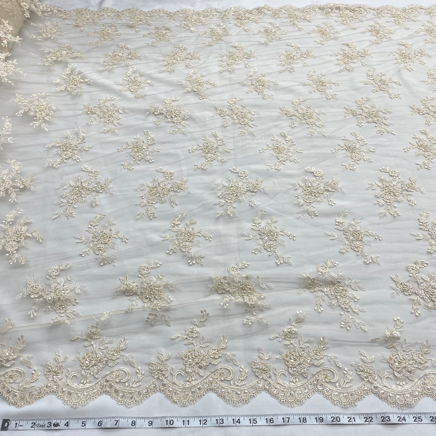 1 Yard Corded Bridal Lace Fabric Embroidered 100 Percent Polyester Net Mesh 50 inch Width - Champagne is backordered and will ship as soon as it is back in stock.