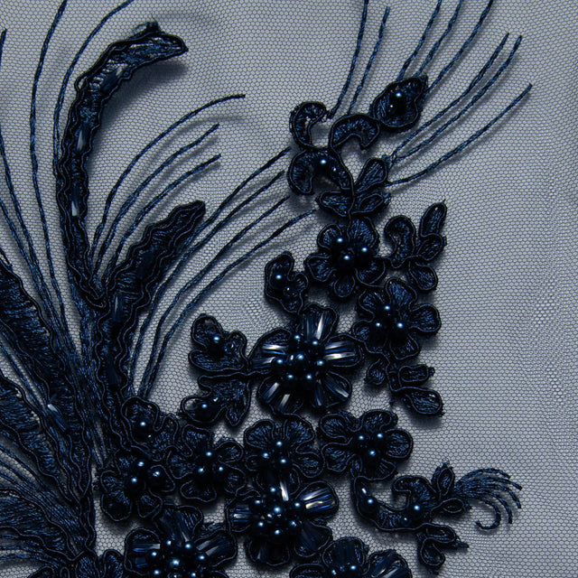 - Texture: Sheer woven tulle with intricate raised embroidery