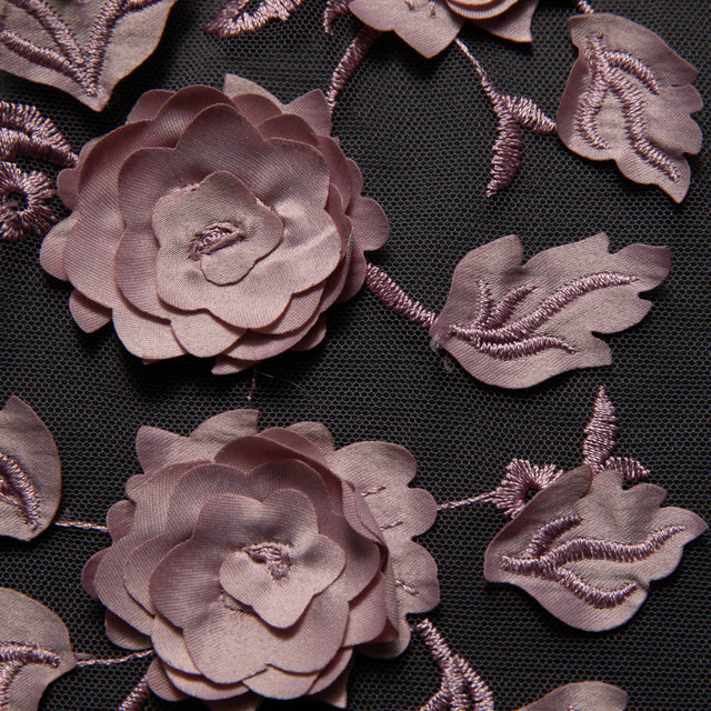 - Texture: Sheer woven base with raised 3D floral embroidery and appliques