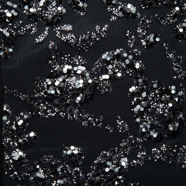 Elevate your creations with this stunning tulle lace fabric featuring a glitter-accented floral design. The fine tulle base is delicately embellished with shimmering glitter, making it ideal for glamorous gowns, bridal veils, costume design, and decorative accessories.