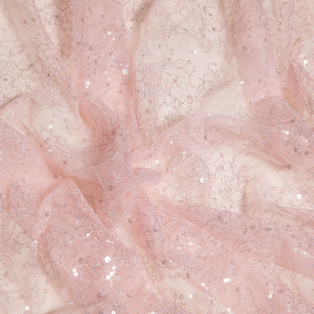 Add timeless sophistication to your creations with this exquisite Chantilly lace fabric, made from 100% nylon. Featuring a soft floral design delicately embroidered with shimmering spangles, this fabric is perfect for eveningwear, bridal gowns, and upscale decor. Its lightweight and sheer texture brings a graceful drape and luxurious finish to any project.