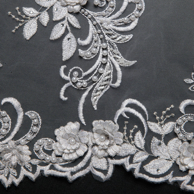 Indulge your senses with this embroidered tulle lace fabric. Its sophisticated 3D floral design, adorned with intricate embroidery and elegant appliques, exudes timeless beauty and refinement. Perfect for creating stunning garments and accessories.